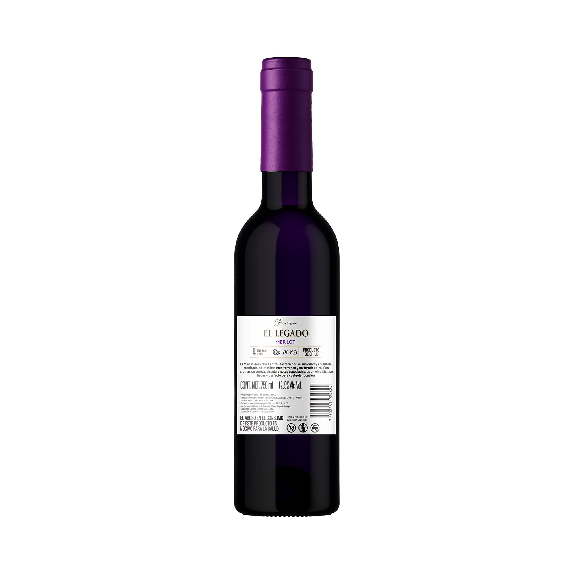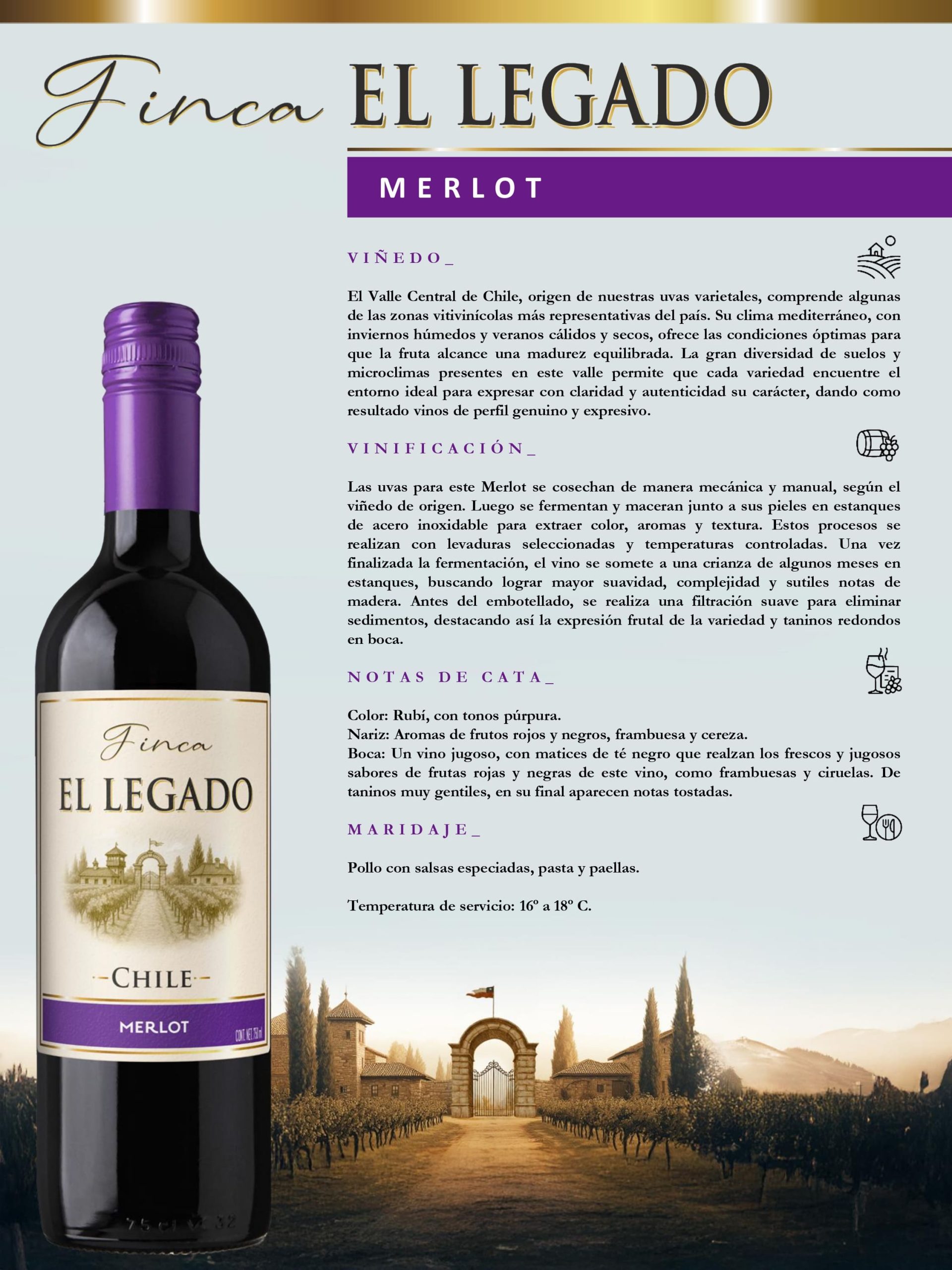 Vino tinto suave, elegante y expresivo, elaborado con uva Merlot lo cual resalta su carácter redondo y amable. Destaca por sus aromas de frutos rojos maduros y ciruela.